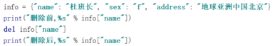 变量info为字典类型: info = {'name':'班长', 'id':100, 'sex':'f', 'address':'地球亚洲中国北京'}说明:'name':'班长'----> 键值对字典和列表一样,也能够存储多个数据列表中找某个元素时,是根据下标进行的字典中找某个元素时,是根据'名字'(就是冒号:前面的那个值,例如上面代码中的'name'、'id'、'sex')字典的每个元素由2部分组成,键(key):值(value)。例如 'name':'班长' ,'name'为键(key),'班长'为值(value)