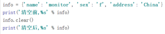 <4>删除元素 对字典进行删除操作,有一下几种:(1)del(2)clear() ---- 清空