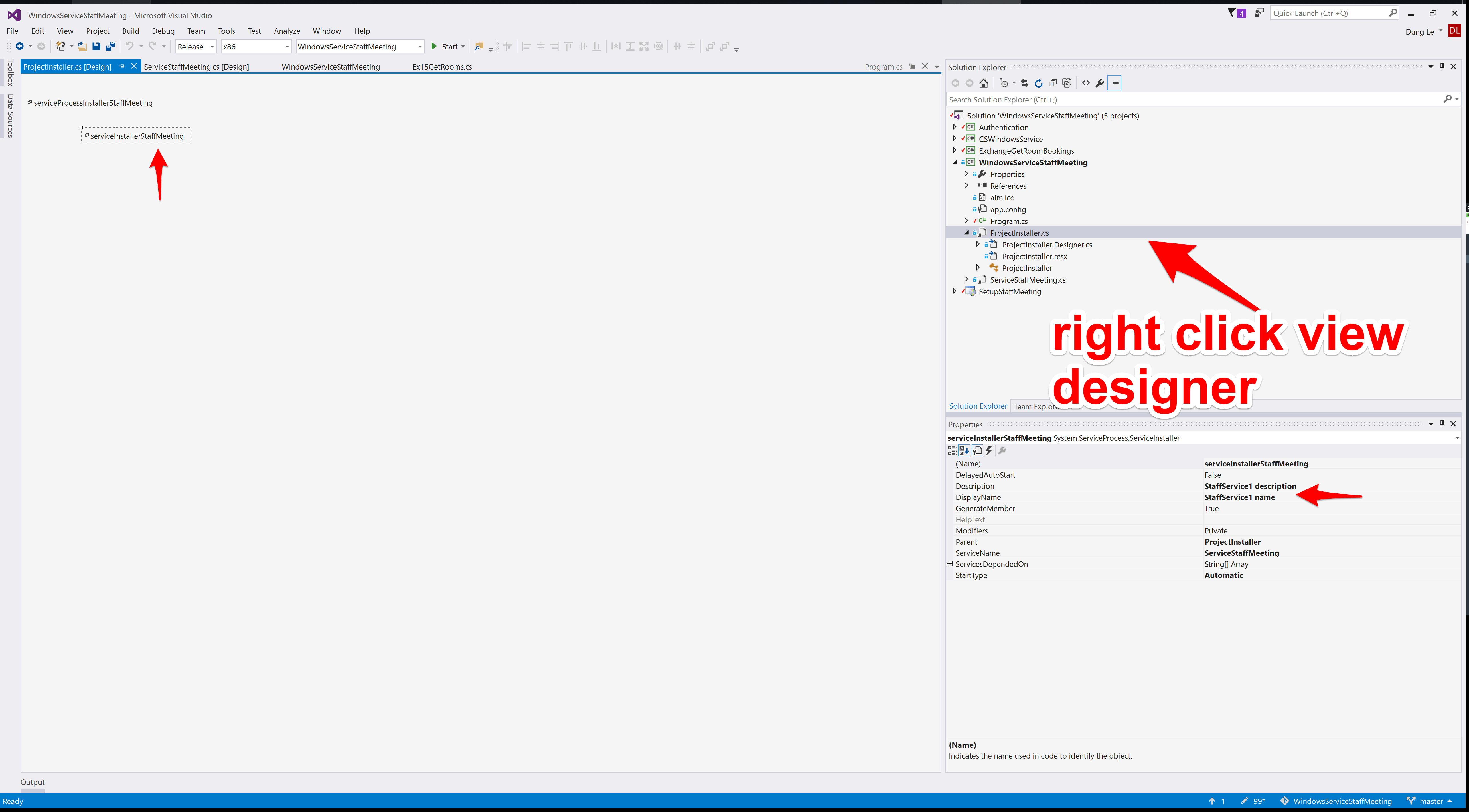 By selecting this ProjectInstaller class you will find two installers on its design view -> 1.ServiceInstaller1 2.ServiceProcessInstaller1