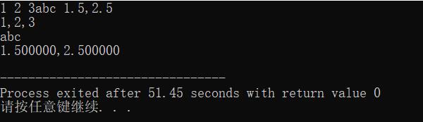 #include <stdio.h>int main() { double x,y; char c1,c2,c3; int a1,a2,a3; scanf("%d %d %d",&a1,&a2,&a3); printf("%d,%d,%d\n",a1,a2,a3); scanf("%c%c%c",&c1,&c2,&c3); printf("%c%c%c\n",c1,c2,c3); scanf("%lf,%lf",&x,&y); printf("%f,%lf\n",x,y); return 0;}