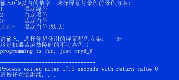 printf("\n请输入, 选择你想使用的屏幕配色方案: ");
