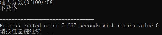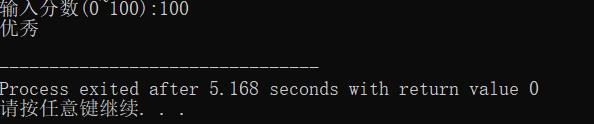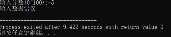 #include<stdio.h>#include<stdlib.h>int main(){ int grade; printf("输入分数(0~100):"); scanf("%d",&grade); if(grade<0||grade>100){ printf("输入数据错误\n"); exit(0);} switch(grade/10){ case 10: case 9:printf("优秀\n");break; case 8:printf("良好\n");break; case 7:printf("中等\n");break; case 6:printf("及格\n");break; default:printf("不及格\n");break; } return 0;}
