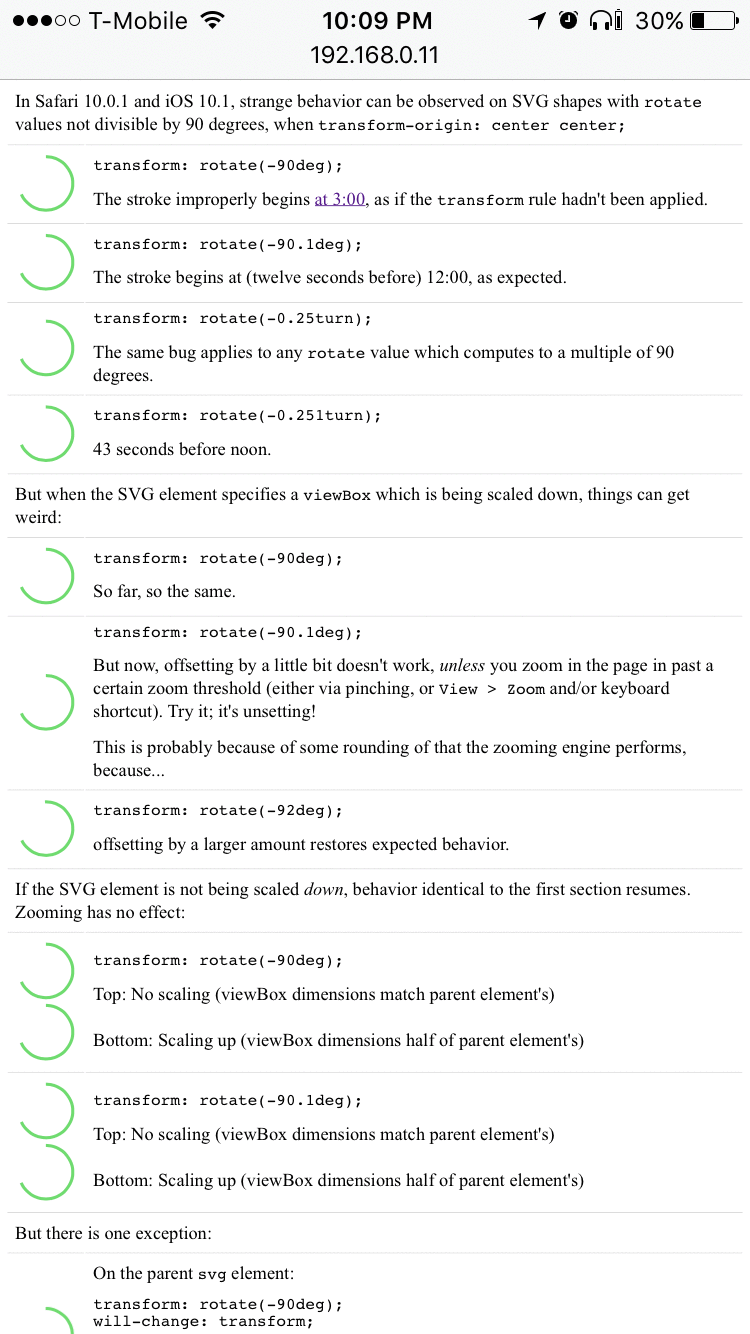 <tr><td colspan="2">In Safari 10.0.1 and iOS 10.1, strange behavior can be observed on SVG shapes with <code>rotate</code> values not divisible by 90 degrees, when <code>transform-origin: center center;</code></td></tr>