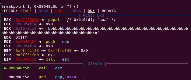 gdb调试:‘very much’ 后输入 ‘aaa’,‘tell me’ 后输入 ‘bbbbbbbbbbb······’。可以看到eax被写入了’aaa’,ecx被写入了’bbbbbbbbbbbbbbbbbbb····’
