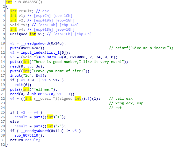 然后就是第22行代码,看不懂就查汇编,对应的汇编是call eax。就是当eax是函数来调用。结合前面的eax会被覆写为输入值,就可以进行ROP。