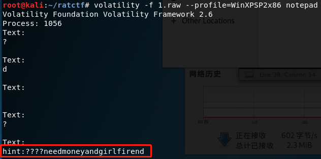 存在记事本进程,查一查有什么:volatility -f Advertising\ for\ Marriage.raw --profile=WinXPSP2x86 notepad