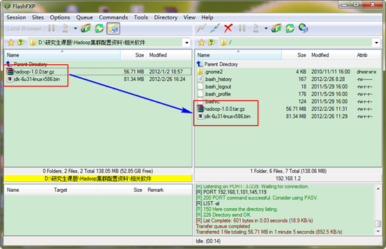 在"Hadoop集群(第3期)"讲了VSFTP的安装及配置,如果没有安装VSFTP可以按照该文档进行安装。如果安装好了,就可以通过FlashFXP.exe软件把我们下载的JDK6.0和Hadoop1.0软件上传到"Master.Hadoop:192.168.1.2"服务器上。
