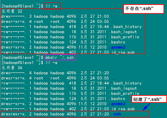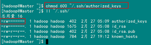 查看"/home/hadoop/"下是否有".ssh"文件夹,且".ssh"文件下是否有两个刚生产的无密码密钥对。