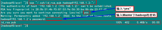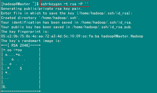 这条命是生成其无密码密钥对,询问其保存路径时直接回车采用默认路径。生成的密钥对:id_rsa和id_rsa.pub,默认存储在"/home/hadoop/.ssh"目录下。
