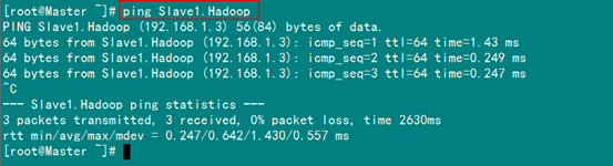 现在我们在进行对机器为"Slave1.Hadoop"的主机名进行ping通测试,看是否能测试成功。