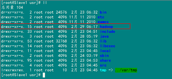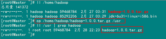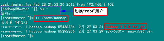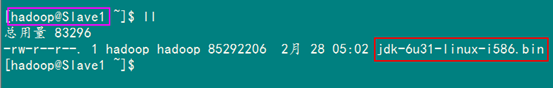 刚才我们用一般用户(hadoop)通过FlashFXP软件把所需的两个软件上传了跟目下,我们通过命令查看下一下是否已经上传了。