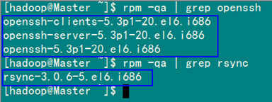 在"Hadoop集群(第1期)"安装CentOS6.0时,我们选择了一些基本安装包,所以我们需要两个服务:ssh和rsync已经安装了。可以通过下面命令查看结果显示如下: