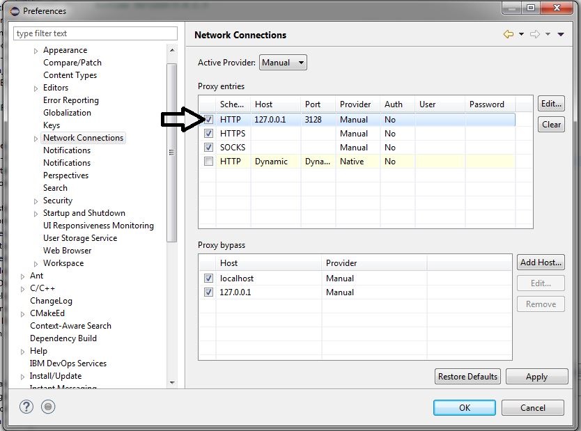 - Go to: Window->Preferences->General->Network Connections