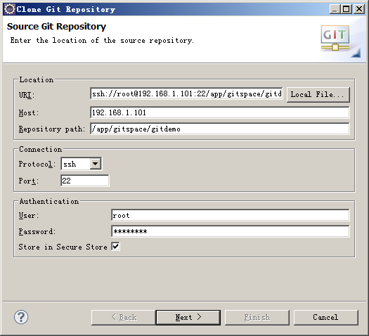 ssh://root@192.168.1.101:22/app/gitspace/gitdemo