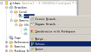 然后将本地mirror分支和remote tracking中的mirror分支进行rebase,先checkout本地mirror分支 ,然后右键点击选择Rebase