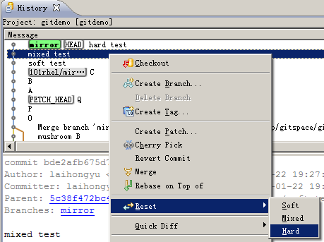 先进行一次提交,提交后在History窗口中重置此次提交,如图: