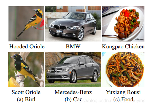 我们可以比较轻松的定位到鸟的各个部位(RACNN和MACNN都有用软硬注意力模型来定位的介绍,感兴趣的可以去看一下)和车的品牌定位,但是却很难区分食物的区别(论文举了这个例子,但是不知道他们提出的模型结构能否正确的区分这两道菜呢?不得而知了。。)