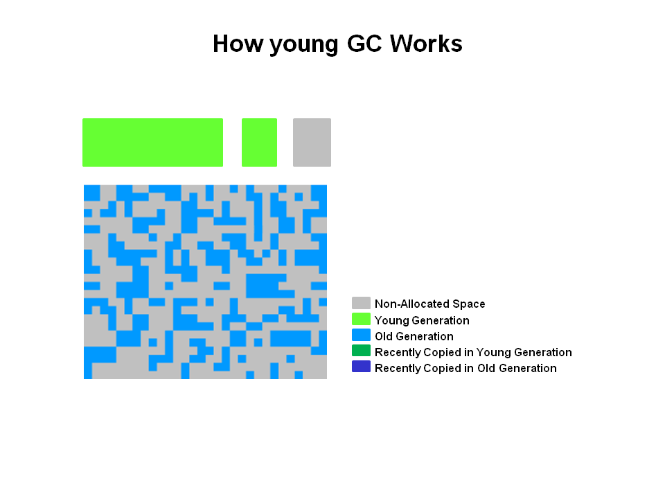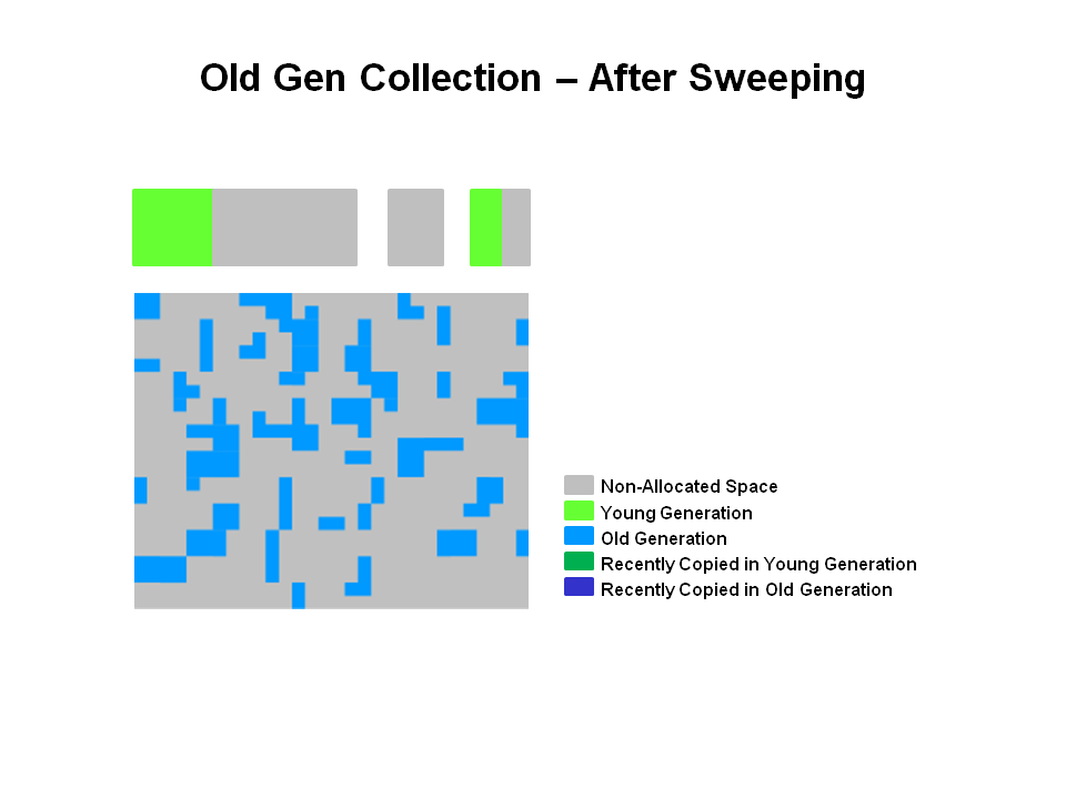 The young generation is colored light green and the old generation in blue. This is what the CMS might look like if your application has been running for a while. Objects are scattered(分散的; 零散的) around the old generation area.