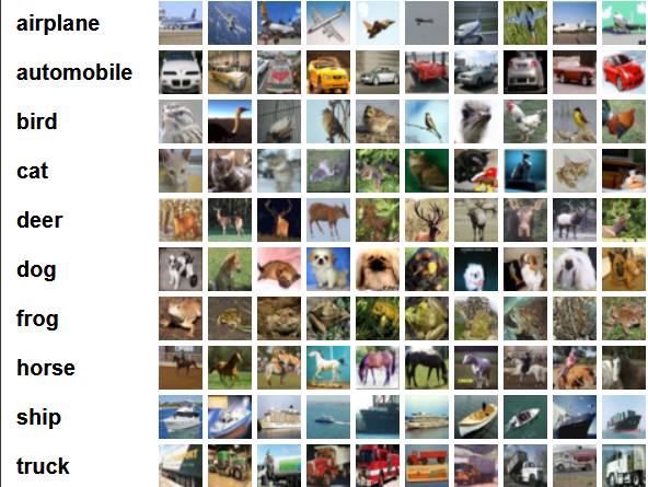 该数据集共有60000张彩色图像,这些图像是32*32的彩色照片,每个像素点包括RGB三个数值,数值范围0~255,分为10个类,分别是'airplane', 'automobile', 'bird', 'cat', 'deer', 'dog', 'frog', 'horse', 'ship', 'truck',每类6000张图。这里面有50000张用于训练,构成了5个训练批,每一批10000张图;另外10000用于测试,单独构成一批。测试批的数据里,取自10类中的每一类,每一类随机取1000张。抽剩下的就随机排列组成了训练批。注意一个训练批中的各类图像并不一定数量相同,总的来看训练批,每一类都有5000张图。