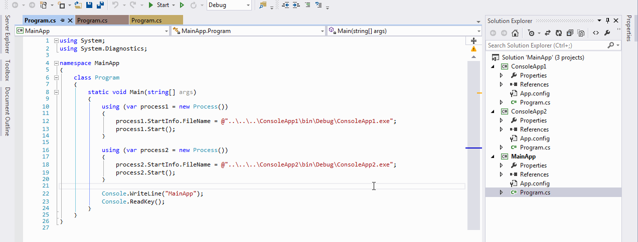 Lets say, I have a Test Application, which is the main application. I have another two Console applications say, ABC and XYZ. Now, when i run the Test Application, the console of both applications ABC and XYZ should appear.
