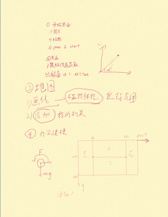 本程序计划使用三个CPP文件及两个对应H文件。 MAIN.cpp存放主函数。Model.cpp为控制、速度及坐标计算等函数。Painting.h为面板绘制、图片资源调用等函数。设计草稿及流程图如下:
