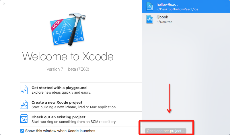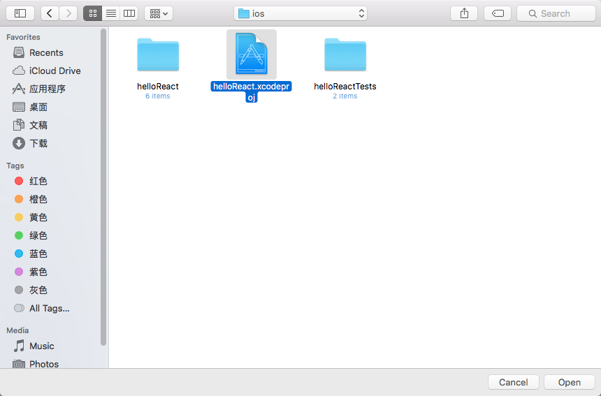 我们选择打开一个项目,打开我们新建的helloReact项目下的ios目录下helloReact.xcodeproj文件,如图2.2.2