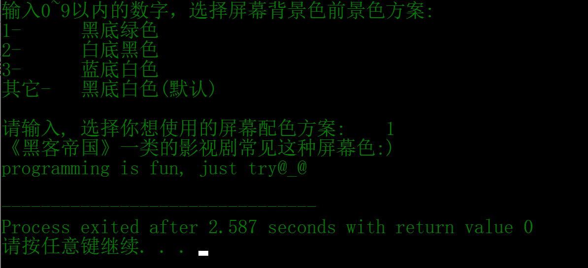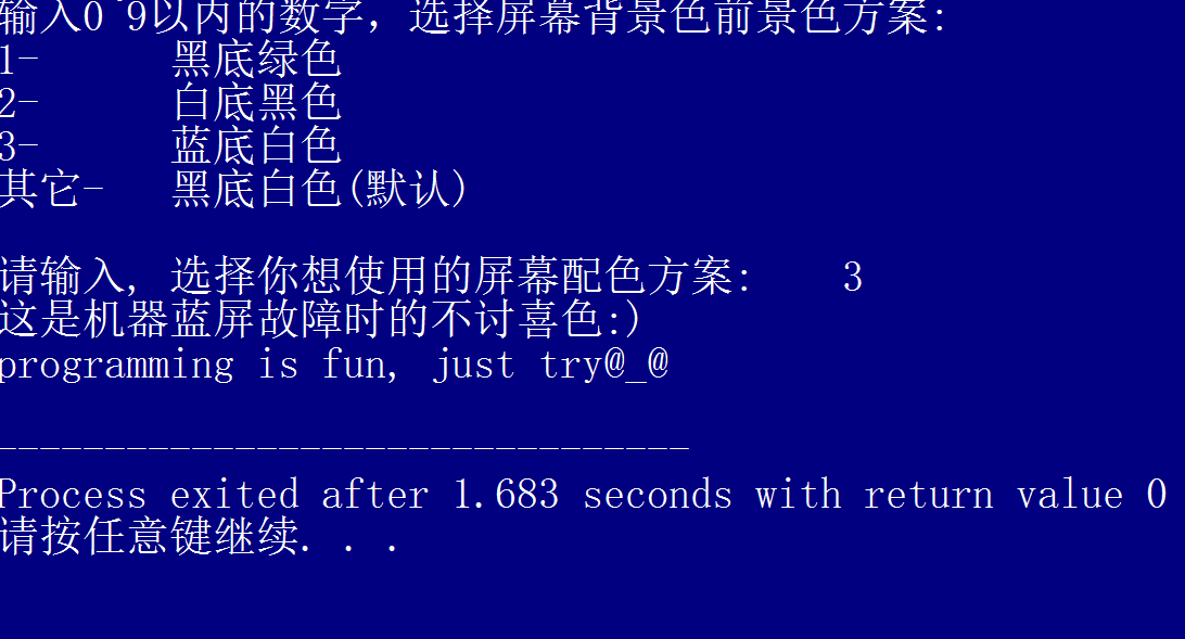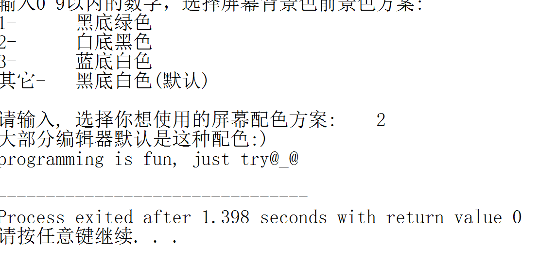 printf("\n请输入, 选择你想使用的屏幕配色方案: ");