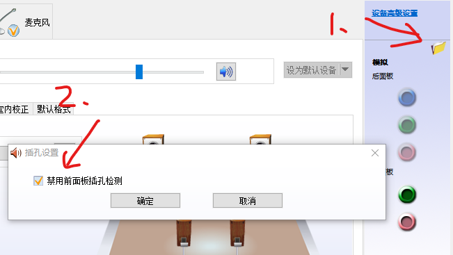 如图进行操作,勾上”禁用前面板检测“,并确定