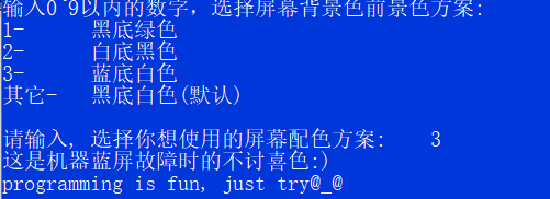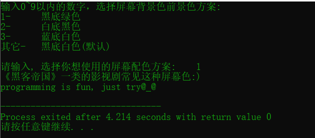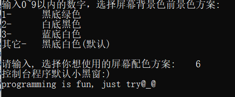 printf("\n请输入, 选择你想使用的屏幕配色方案: ");