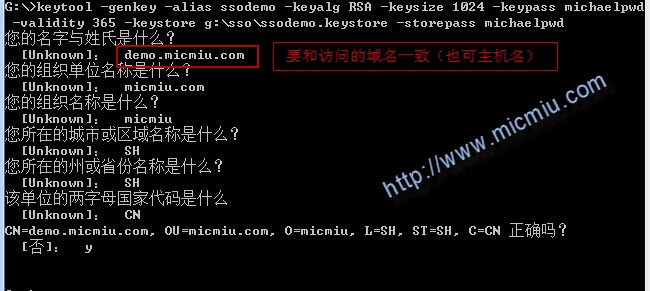 keytool -genkey -alias ssodemo -keyalg RSA -keysize 1024 -keypass michaelpwd -validity 365 -keystore g:\sso\ssodemo.keystore -storepass michaelpwd |