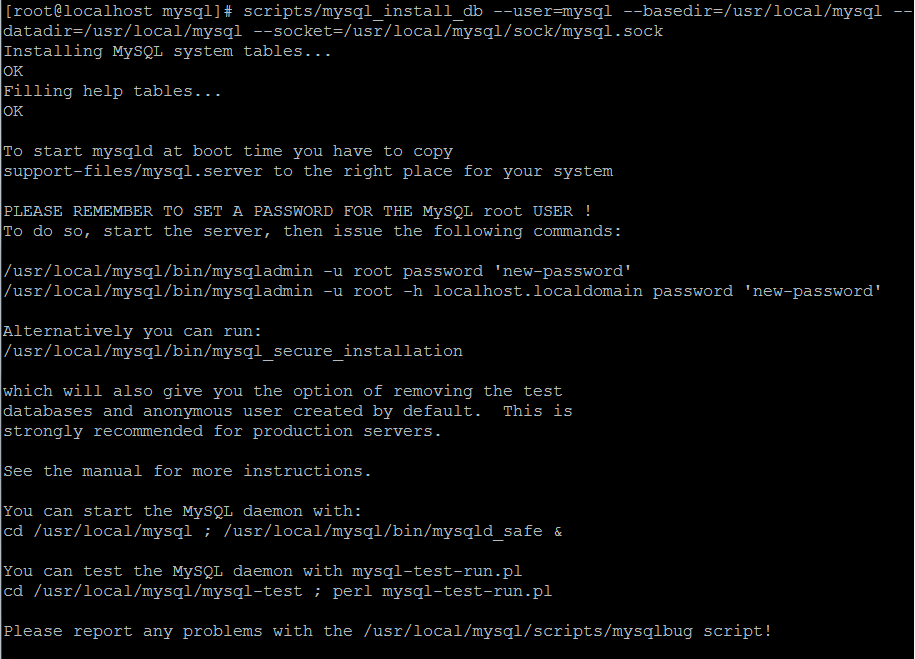 [root@localhost mysql]# scripts/mysql_install_db --user=mysql --basedir=/usr/local/mysql --datadir=/usr/local/mysql