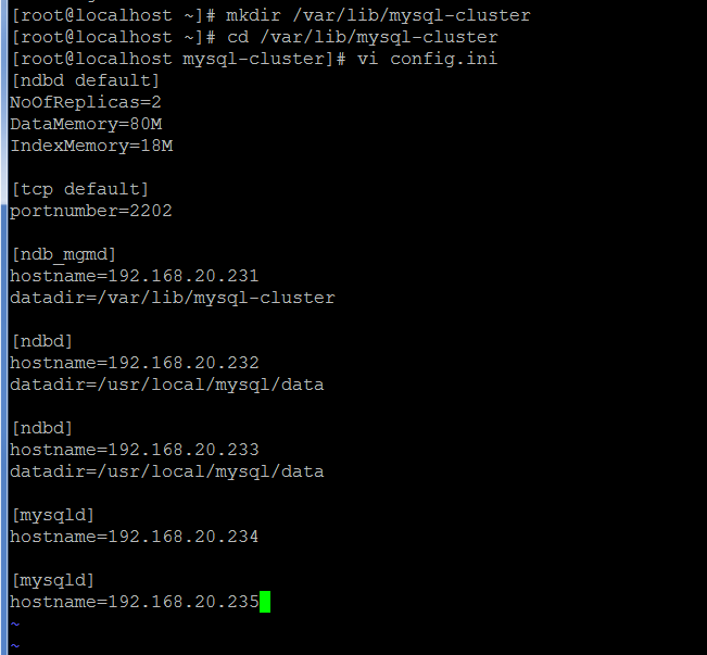 [root@localhost ~]# cd /var/lib/mysql-cluster