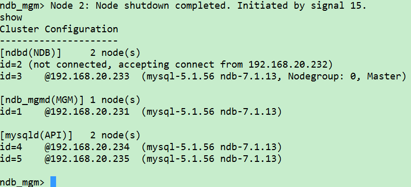 测试成功,当有一个NDB节点Crash后,整个MySQL Cluster环境仍可以正常服务。