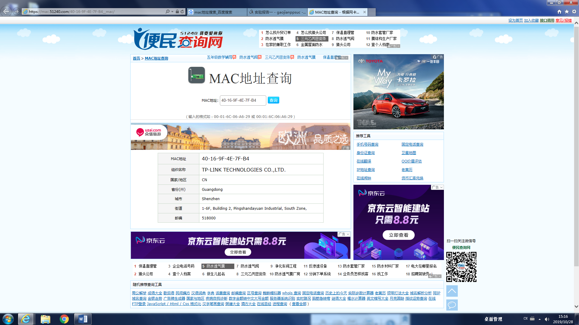 在一个案件中,获取了犯罪嫌疑人的一个MAC地址:40-16-9F-4E-7F-B4,请查询该MAC地址对应的厂商是(附截图)