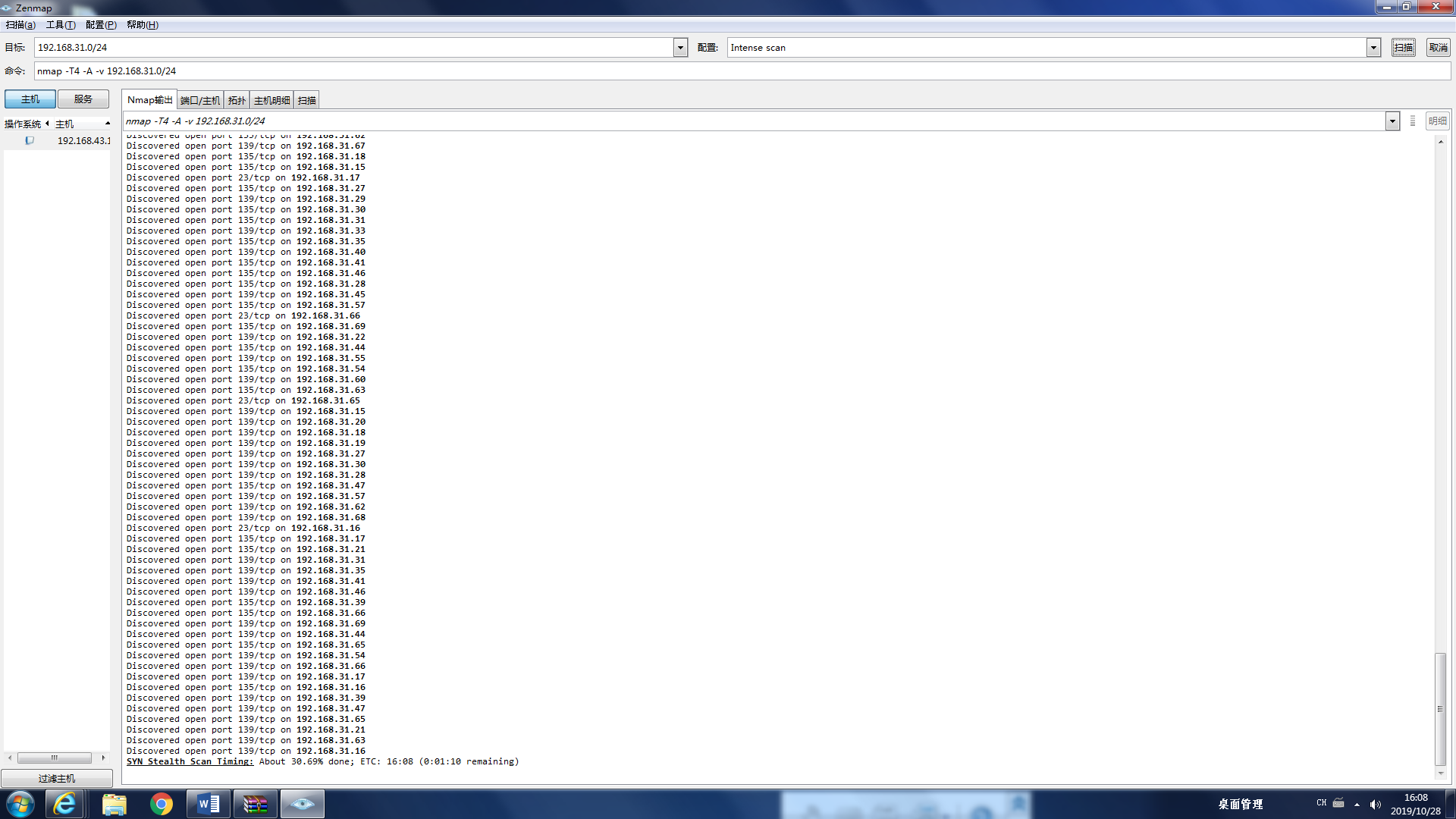 选择一个存活IP地址,扫描所开放的端口(分别用ping扫描,syn扫描尝试),并查询常用端口所对应的服务及操作系统信息。