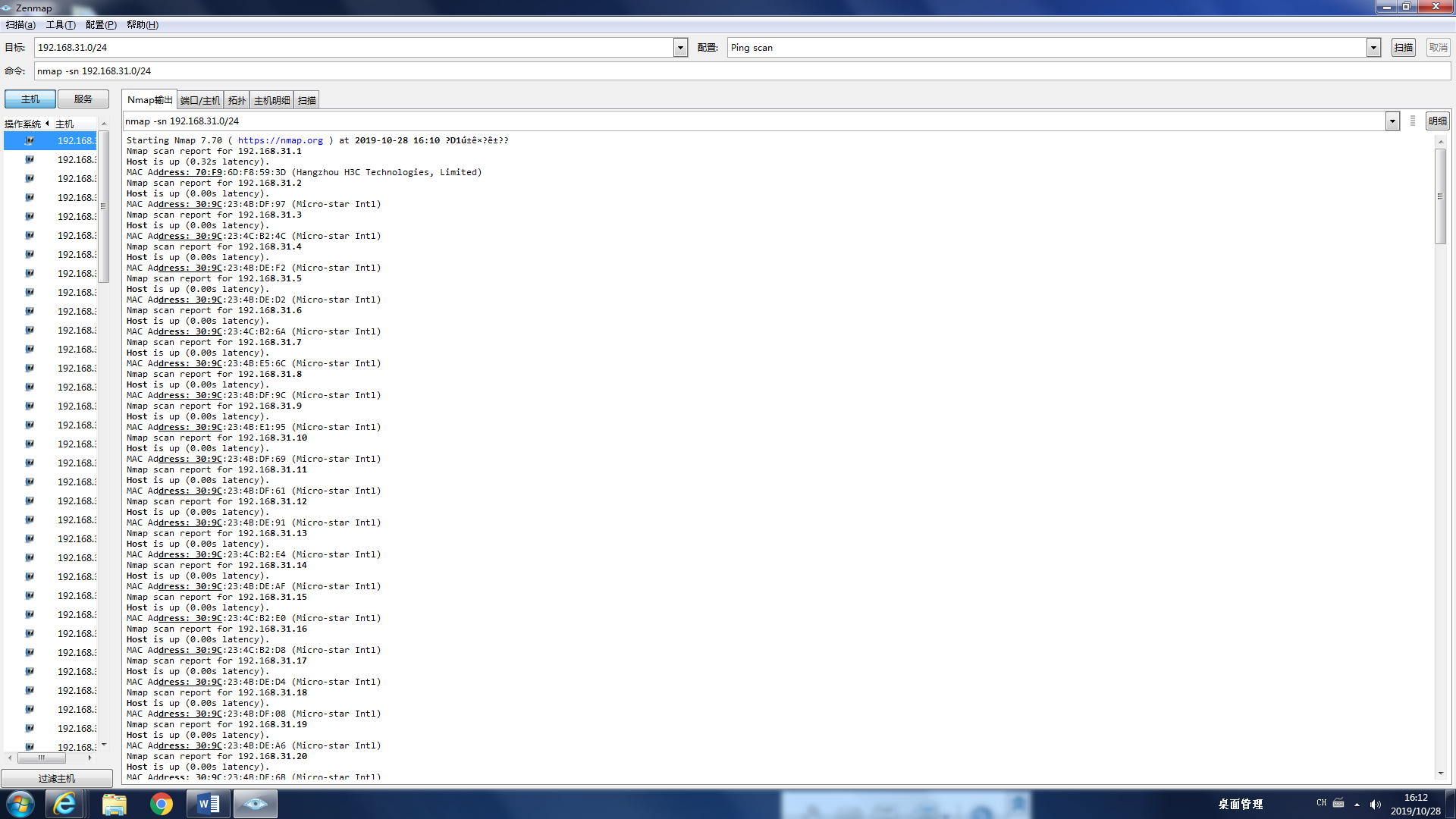 请查询本机的IP地址和子网掩码,并在局域网中扫描本网段内的所有存活主机(附搜索截图)