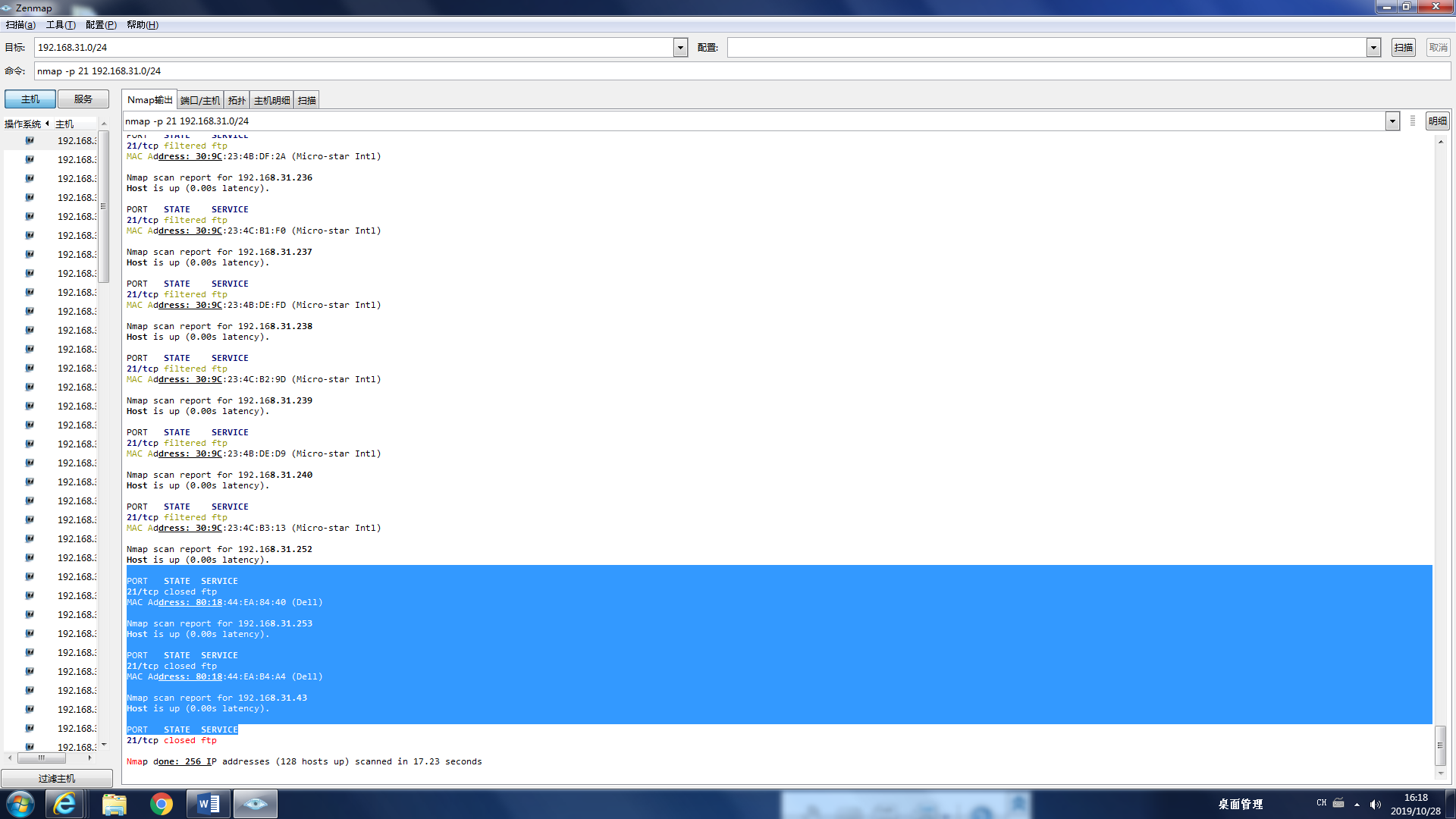 在实验楼上网的局域网内,请扫描出来,哪些机器开启了ftp服务,哪些机器开启了远程桌面连接服务,并附截图证明。