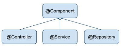 在目前的 Spring 版本中,这 3 个注释和 @Component 是等效的,但是从注释类的命名上,很容易看出这 3 个注释分别和持久层、业务层和控制层(Web 层)相对应。