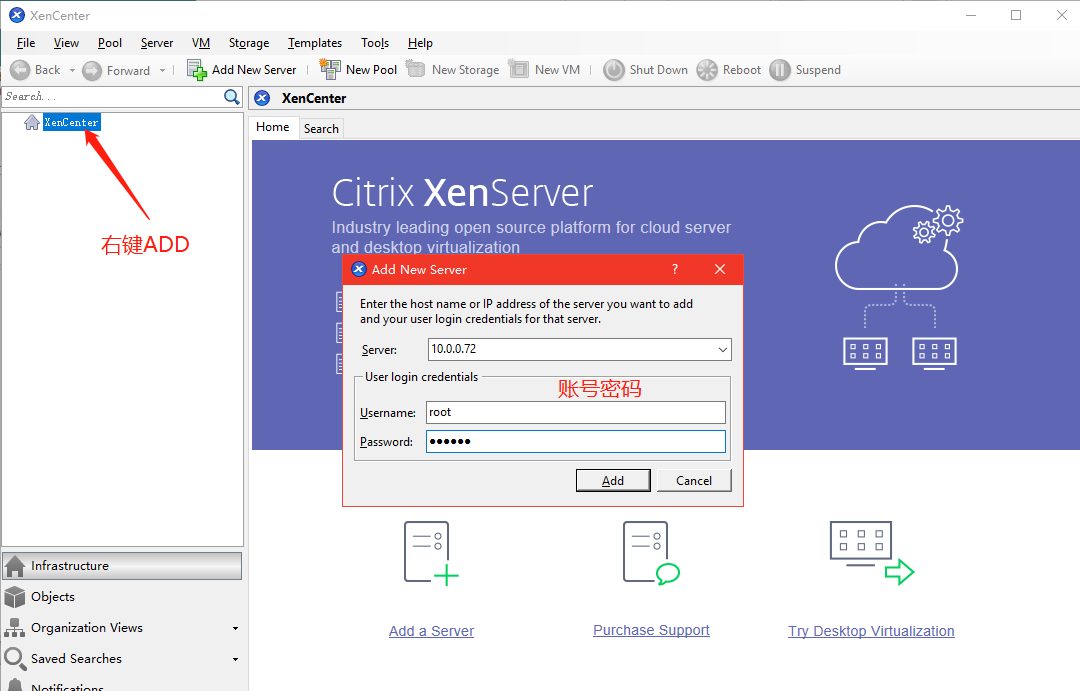 - 打开XenCenter,右键点击XenCenter->Add,来添加一个XenServer服务器,输入ip,root和密码,连上XenServer服务器