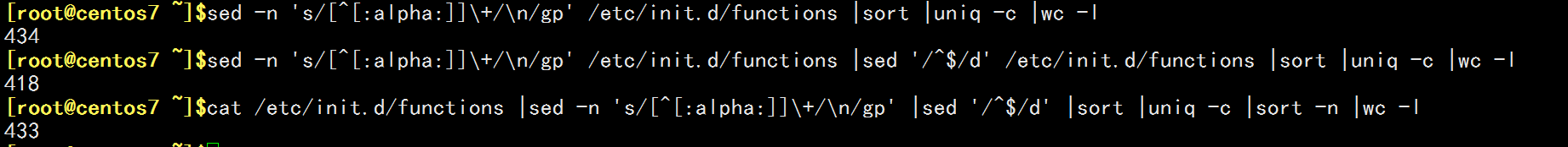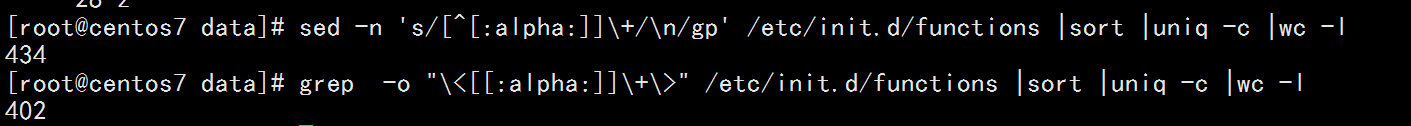 [root@centos7 data]# sed -n 's/[^[:alpha:]]\+/\n/gp' /etc/init.d/functions |sort |uniq -c