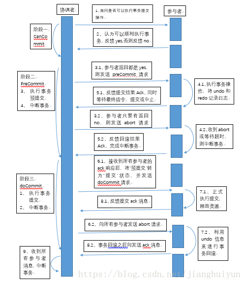 为了避免在通知所有参与者提交事务时,其中一个参与者crash不一致时,就出现了三阶段提交的方式。三阶段提交在两阶段提交的基础上增加了一个preCommit的过程,当所有参与者收到preCommit后,并不执行动作,直到收到commit或超过一定时间后才完成操作。