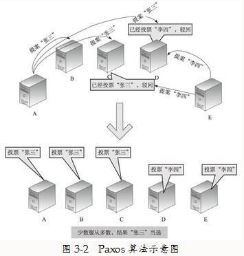 如果C计算机发生了网络问题或者故障,A、B、D投票“张三”,E投票“李四”,那么结果为“张三”当选,而C对于这些情况一无所知,但是当C计算机恢复正常时,他会发起一个“询问谁是CEO”的议案获取最新信息。简言之,Paxos对每个节点的并发修改采取编号记录的方式保持一致性,对多个节点的并发修改采取少数服从多数的方式保持一致性。Paxos有点类似分布式二阶段提交方式,但是又不同,二阶段提交不能是多数节点同意,必须是全部同意。为了遵守过半节点同意的约束,Paxos算法往往要求节点总数为奇数。