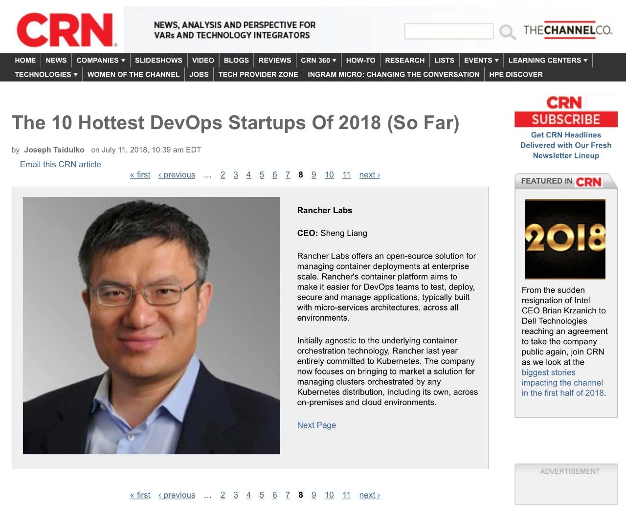 2018年7月11日,CRN评选的“2018年十大最热DevOps初创企业”的榜单出炉,选出了十大CRN评估认为推动业界向DevOps世界转变的企业,Rancher Labs作为全球领先的企业级容器与Kubernetes平台提供商入选该榜单。