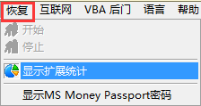 Advanced Office Password Recovery的“恢复”菜单听上去有一丝神秘的感觉,“恢复”菜单下面一共有4个子选项,分别为“停止”、“开始”、“显示扩展统计”和“显示MS Money Passport密码”。这些子选项都是用于Office密码破解工具恢复密码的过程中。