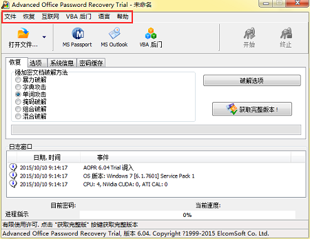 根据对用户使用软件习惯的调查,使用软件时用户会首先观察软件的菜单栏以及主界面。AOPR的主界面一共有6项菜单,除了常设的文件、帮助菜单,还有另外4个与密码破解息息相关的菜单,均为Office密码破解软件特有的。下面小编将会具体介绍,Advanced Office Password Recovery的菜单栏如下图所示: