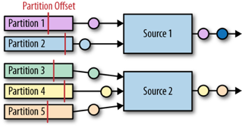 Flink Kafka connector以并行的方式读入事件流,每个并行的source task 都可以从一个或多个partition读入数据。Task对于每个它当前正在读的partition,都会追踪当前的offset,并将这些offset数据存储到它的检查点数据中。当发生故障,进行恢复时,offset被取出并重置,使得数据可以在上次检查点时的offset继续读数据。Flink Kafka connector并不依赖于Kafka 本身的offset-tracking 机制(也就是consumer groups机制)。下图显示的是partitions被分配给不同的source task: