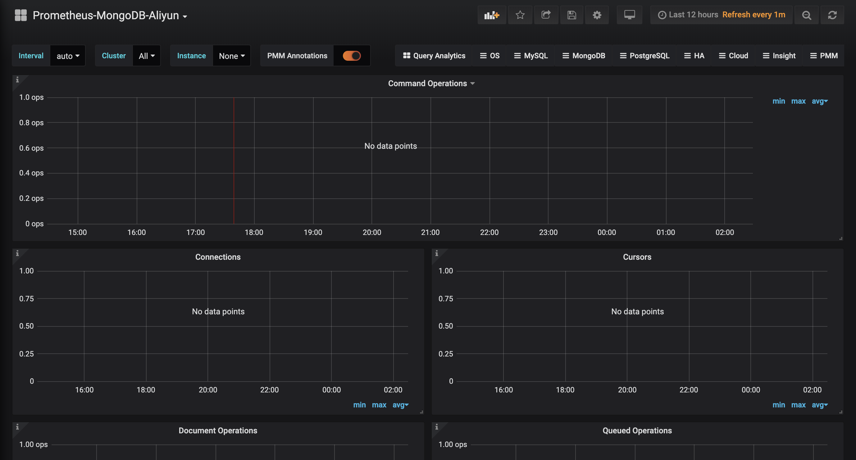 六、添加Prometheus模板,添加mongoDB.json格式模板数据(这边还没有数据,所以监控的数据都是空的),下载地址:git clone https://github.com/percona/grafana-dashboards.git