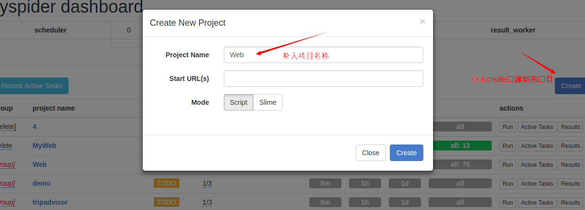 3.在web控制台点create按钮新建任务,项目名自定义,本例项目名为Web