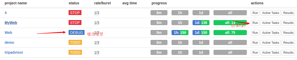 ④DEBUG/RUNNING- 这两状态都会运行爬虫,但是他们之间是有区别的.一般来说调试阶段用DEBUG状态,线上用RUNNING状态.