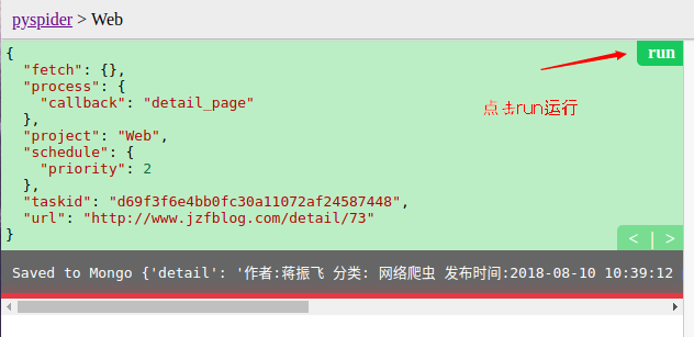 5.上面已经编写的代码使用了response.doc,不难发现其用的是PyQuery的解析库,以访问我的个人网站为例,将http://scrapy.org/改为:http://www.jzfblog.com/,并将文章信息存储到MongoDB数据库中